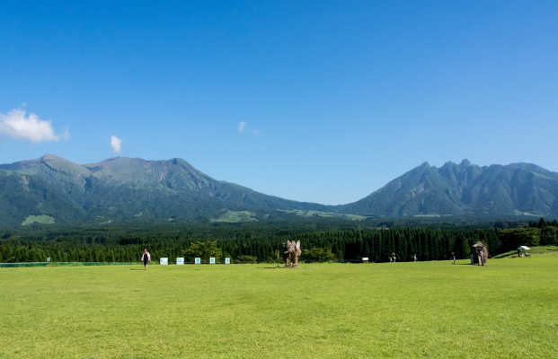 高森の月廻り公園は広々とした緑の公園で、眼前には広大な阿蘇が望めます。遊具もあるのでご家族ずれも多く、のんびりと過ごすにはピッタリの公園です。